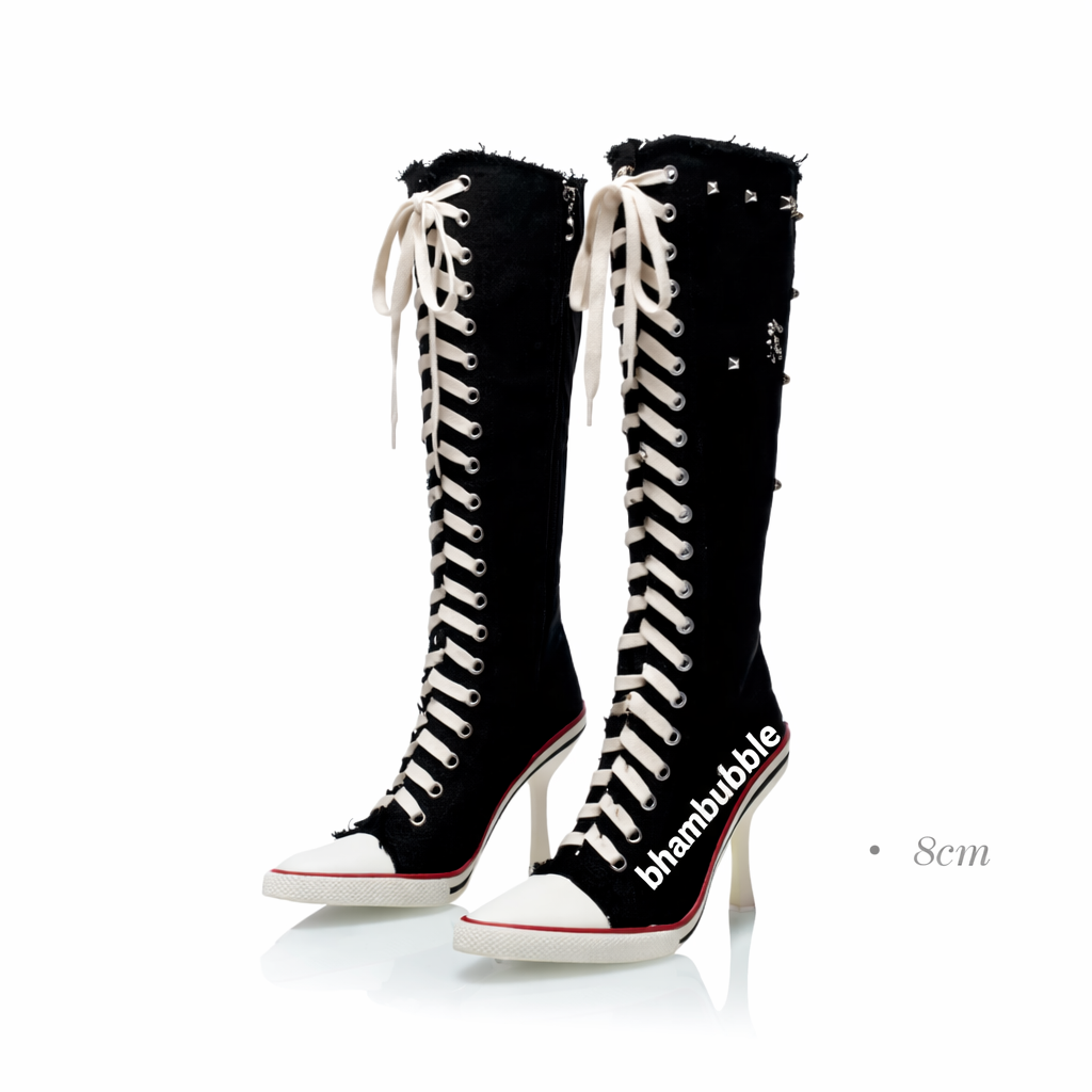 Inspired by the rebellious energy of contemporary city life, these boots draw from punk and streetwear aesthetics while maintaining a high-fashion sensibility. Each metal stud is carefully placed to enhance the boot’s edgy look without compromising elegance. The high-heel structure is crafted to give a strong, empowered stance, while the streamlined knee-high shaft creates a bold, elongated silhouette.